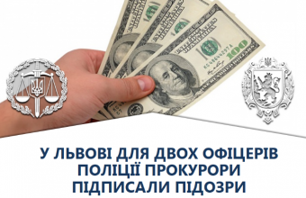 Про це повідомили в середу, 25 березня, в прокуратурі Львівської області, де також розповіли: «За версією слідства, ідеться про начальника сектору превенції патрульної поліції одного із відділів ГУ Нацполіції у Львівській області та дільничного офіцера, які у грудні 2019 року змовившись, вимагали та одержали від особи 300 доларів хабаря за не притягнення до кримінальної відповідальності за нібито вчинене домашнє насильство та опір правоохоронцям. У середу, 25 березня цього року, їм вручили підозри у вчиненні кримінального правопорушення, передбаченого частиною 3 статті 368 Кримінального кодексу України (прийняття пропозиції, обіцянки або одержання неправомірної вигоди службовою особою)».