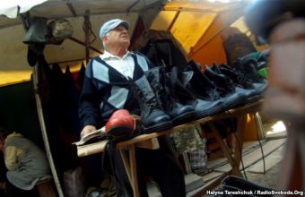 Намет, у якому продавались берці нового зразка, був зачинений. Як пояснили продавці, жінку, яка торгувала військовими черевиками по 1400 гривень, попросили сьогодні не виходити на роботу, мовляв, має приїхати перевірка з Києва. Продавець розповіла людині, яка фотографувала черевики днем раніше, що взуття приніс військовий.