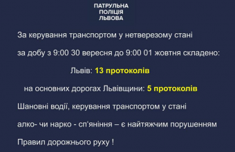Львівські патрульні оформили за добу 18 протоколів про керування в нетверезому стані. Лише цієї ночі вони зупинили 17 водіїв, які перебували в стані алкогольного й наркотичного сп‘яніння. Усі вони порушили при цьому правила дорожнього руху. Про це повідомили сьогодні, 1 жовтня, на сторінці патрульної поліції Львова в інтернет-мережі «Facebook».