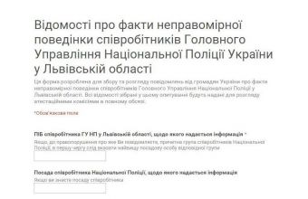 «Незабаром у Львівській області розпочнеться процес атестації працівників поліції. Надати атестаційним комісіям Національної поліції інформацію про неправомірну поведінку будь-якого співробітника Головного управління Національної поліції у Львівській області Ви можете, заповнивши форму, подану за посиланням тут. Усі відомості, зібрані у цьому опитуванні, будуть передані для розгляду атестаційним комісіям у повному обсязі», – повідомили сьогодні, 16 лютого, в прес-службі Львівського обласного управління Національної поліції.