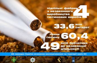 У результаті тристоронньої міжнародної співпраці спільно з Цивільною Гвардією Королівства Іспанія та Податковою і митною адміністрацією Королівства Нідерландів, у вересні-жовтні поточного року на території ЄС припинено діяльність чотирьох підпільних ліній з виробництва тютюнових виробів, затримано 49 причетних до їх діяльності осіб, вилучено 33,6 млн цигарок, 60 400 кг тютюну та виробниче обладнання, викрито незаконну експлуатацію 28 громадян України.