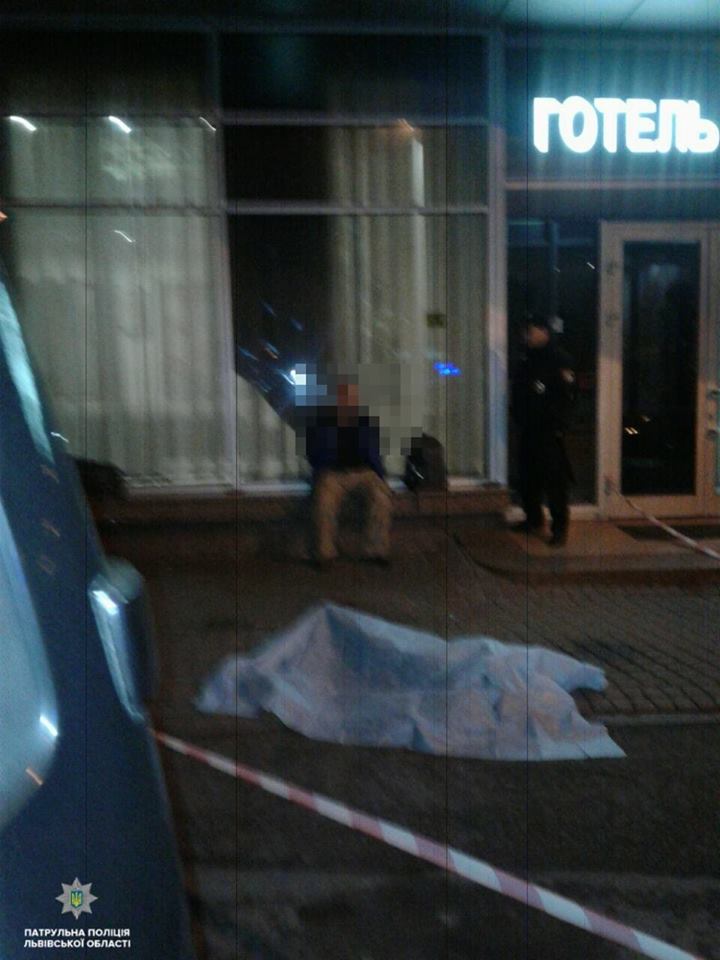 Перехожий повідомив близько п’ятої години ранку до патрульним біля готелю на проспекті Чорновола, що перед його головним входом людині встромили ніж і, можливо, вбили.