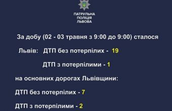 «У ніч з другого на третє травня у Львові зупинили 14 водіїв, які керували транспортними засобами у стані алкогольного сп‘яніння. І ще сімох водіїв – на основних дорогах Львівщини.