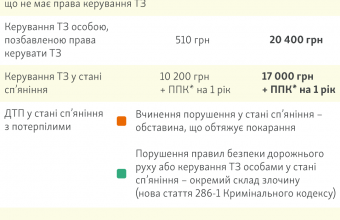 1. Підвищується відповідальність за ст. 130 КУпАП (Керування транспортними засобами особами, які перебувають у стані алкогольного, наркотичного чи іншого сп'яніння або під впливом лікарських препаратів, що знижують їх увагу та швидкість реакції):