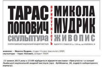 «Виставка «Присутність» – це синтез скульптурної та живописної експозиції в межах одного виставкового простору. Живопис представлений роботами студента 4 курсу – Миколи Мудрика (факультет ОМІР, спеціальність – реставрація творів мистецтва), скульптура – Тараса Поповича (аспірант ЛНАМ). На живописних полотнах митець вуалює власну присутність, робить натяк на щось конкретно чуттєве, асоціативне.