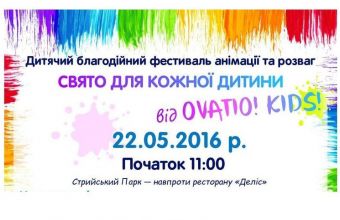 «У неділю, 22 травня, о 11:00 у Стрийському парку, навпроти ресторану «Деліс» відбудеться благодійний фестиваль анімації та розваг «Свято для кожної дитини від «Ovatio! Kids!», – повідомили Щоденному Львову» в прес-службі міськради, де також розповіли подробиці: «У програмі заходу: анімаційні програми для дітей різного віку, бульбашкове та наукове шоу, бейбісітери для найменших, твістінг, аквагрим, фокусники, дитячі вечірки, спортивні змагання, майстер класи, ростові ляльки, солодке пригощення та багато іншого. У святі візьмуть участь дітки з багатьох сиротинців Львівщини, діти учасників АТО, з малозабезпечених та багатодітних сімей».