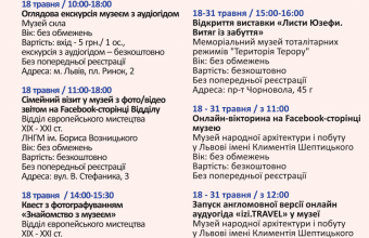 «Програма передбачена для дорослих, дітей та молоді. 18-31 травня є можливість відвідати музеї за доступними цінами або стати учасником безкоштовних заходів, а 18 травня з нагоди Міжнародного дня музеїв – вільний вхід у музеї», – поінформували також у міськраді прес-службі Львівської міськради та опублікували програму заходів у музеях.