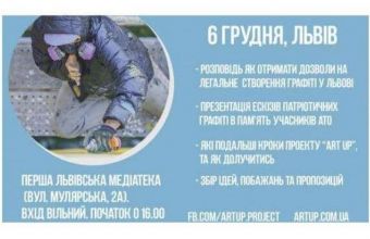 «6 грудня, до дня Збройних Сил України, у Львові презентуватимуть ескізи графіті та арт об'єктів, що будуть намальовані на стінах та зовнішніх площинах у Львові, в пам'ять учасників АТО. Презентація ескізів та обговорення деталей проекту відбудеться у Першій Львівській Медіатеці на вулиці Мулярській (№2а). Цей захід – це частина проекту «АртАп», що здійснюється за підтримки Львівської міської ради.