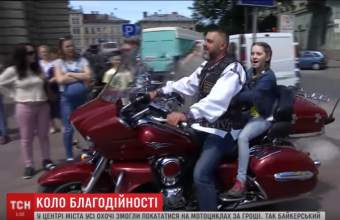 «У Львові з півсотні байкерів катали усіх охочих, аби зібрати гроші для хворих на рак дітей. Плата за кілька хвилин – щонайменше 100 гривень. Проте люди давали й більше, бо усі зібрані кошти підуть на лікування важкохворих дітей. За чотири години байкери розважили півтори сотні людей. Переважно проїхатись на мотоциклі хотіли діти. Проте деякі дорослі зізнавались, що вперше сіли на двоколісний і здійснили свою давню мрію. Загалом під час акції зібрали понад 20 тисяч гривень», – повідомили сьогодні, 29 травня, в «Телевізійній службі новин» каналу «1+1». Подробиці – на її відео: