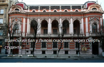 Організатори запланованого на 30 листопада благодійного віденського балу у Львові повідомили сьогодні, 29 листопада: «Вчора, 28-го листопада, сталася трагедія для спільноти Франкового вишу – відійшов у вічність наш студент. За попередньою інформацією, похорон відбудеться у четвер, 30 листопада. Тому змушені повідомити, що благодійний бал, у зв’язку з цим, скасовується. З повагою до кожного щиро просимо вибачення. Сподіваємося на розуміння та підтримку! Повернути кошти за придбані квитки можна до 15 грудня у 124 аудиторії (Студентський уряд Львівського національного університету імені Івана Франка) або за номерами телефонів: 0 (96) 640 30 77, 0 (73) 221 33 91. Усі неповернені кошти після 15 грудня буде передано на лікування Жені Зеча. Хлопчик хворіє нейробластомою заднього середостіння заочеревинного простору, 3 стадія ТЗН ХМО».