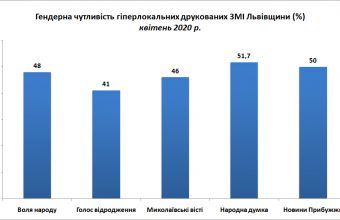 Згідно результатів моніторингу Індекс гендерної чутливості львівських гіперлокальних медіа у квітні склав 40% (всього на 1% менше, ніж у лютому, що зумовлено великою кількістю офіційної інформації, пов’язаної з COVID-19). Це – один із найкращих показників серед 24 регіонів України. Ознайомитися із загальними результатами моніторингу гіперлокальних медіа можна на сайті Волинського прес-клубу.