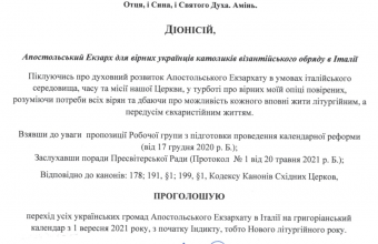 перехід усіх українських громад Апостольського Екзархату в Італії на григоріанський календар з 1 вересня 2021 року, з початку Індикту, тобто Нового літургійного року», - йдеться в Декреті.