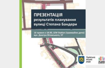 У Львівській міськраді повідомили сьогодні, 12 травня: «Інститут міста наступного тижня презентуватиме результати планування реконструкції вулиці Степана Бандери. Презентація розпочнеться у вівторок, 16 травня, о 18.30 у соціальному хабі «Lem station» на вулиці Вітовського, 57 (територія трамвайного депо). До зустрічі запрошують всіх охочих львів’ян – вхід вільний».
