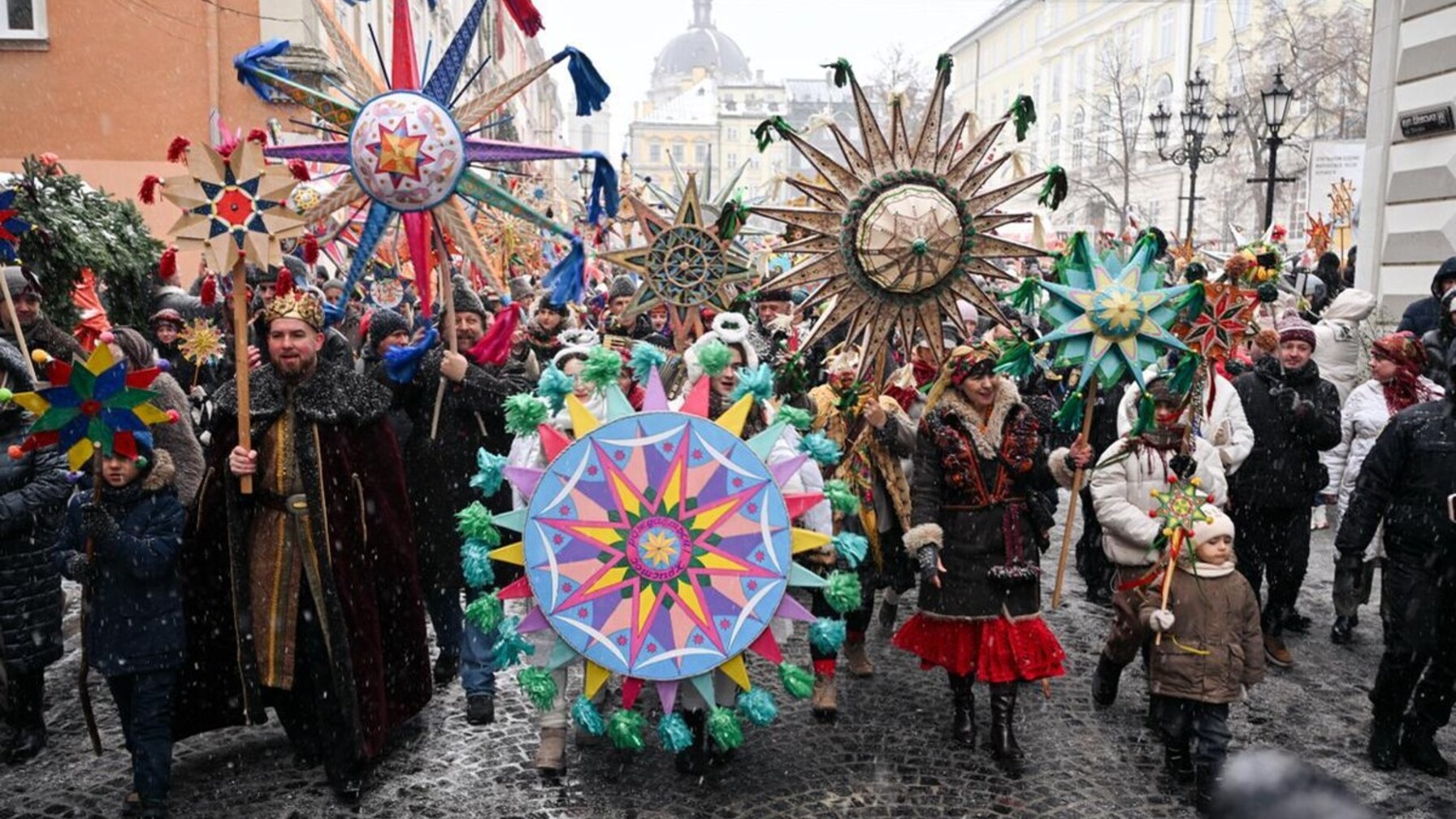 Музиканти грають, а сотні людей довкола зі звіздами в традиційному українському вбранні та образах вертепу колядують, під час Ходи Звіздарів на одній з центральних вулиць Львова
