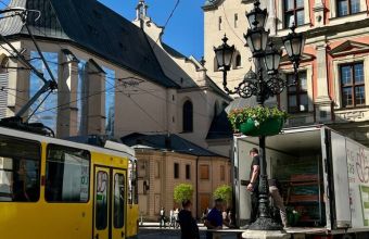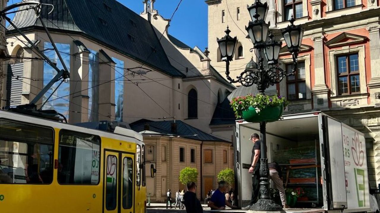 На пл. Ринок, з боку головного входу, заквітчують історичні ріжкові ліхтарі вазонами з сурфініями.