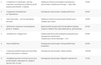«За результатами роботи конкурсної комісії, вирішили підтримати перші 9 проектів у рейтингу в повній мірі, а наступні 10 проектів у рейтингу – підтримати частково (з коригуванням їх кошторисів). Загальна сума фінансової підтримки цих проектів за рахунок коштів міського бюджету Львова – один мільйон гривень», – повідомили також у ЛМР та оприлюднили «Перелік соціально-культурних проектів громадських організацій у галузі «Соціальний захист».