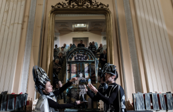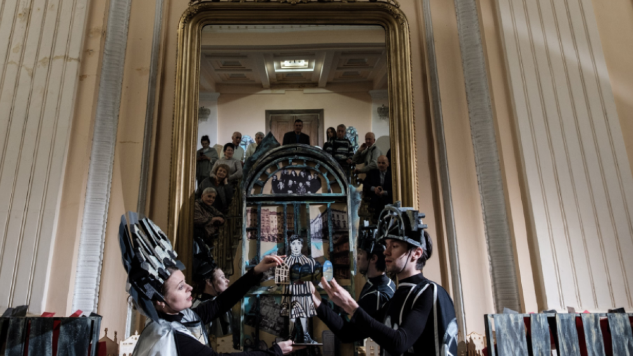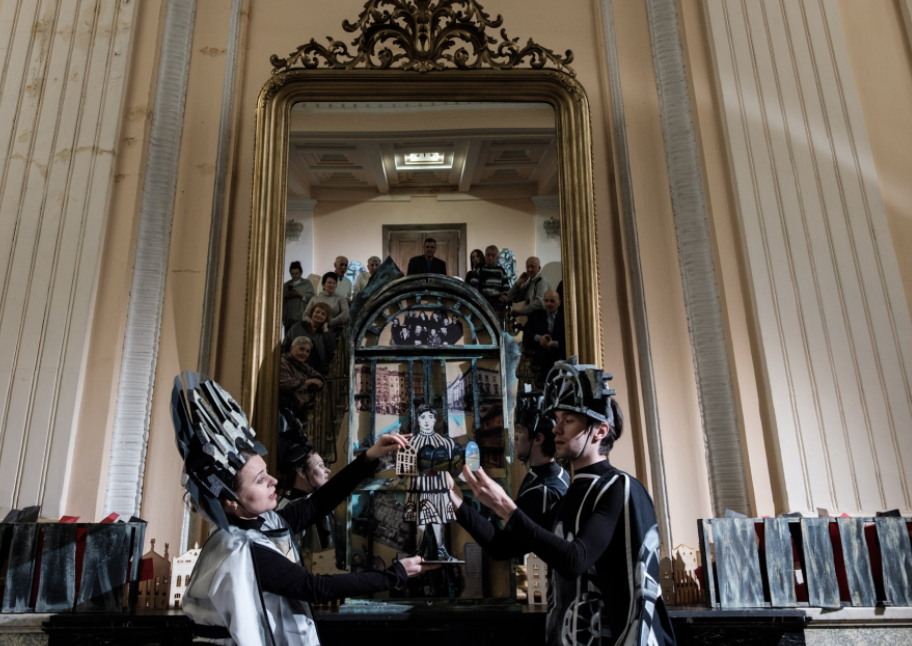 Про історію будівлі й про заснування театру у театралізованій постановці розповіли актори Христина й Антон. Споруджена будівля у 1912-13 роках і спершу тут були реміснича палата і кінотеатр, а у міжвоєнні роки – Будинок народної творчості.
