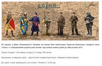 Опісля і до 13:00 тут відбудеться другий етап інтерактивної акції «Творимо історію разом». Так усі охочі зможуть долучитись до складання пазлів «Герої», подивитись на показові бої лицарів епохи середньовіччя та показовий виступ з бойового гопака.