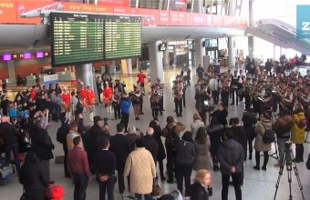 У Львові влаштували сьогодні, 28 грудня,новорічно-різдвяний флешмоб – духовий оркестр «Львівські фанфари» спільно з дівчатами-мажоретками дав концерт у львівському аеропорту, в якому взяли участь близько півсотні музикантів. Учасники флешмобу грали посеред зали в аеропорту різдвяні світові хіти.