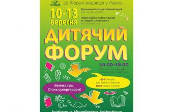 «Вперше у межах Форуму видавців відбудеться Дитячий Форум. Це 400 різноманітних акцій для дітей та батьків. Всі події будуть відбуватися у Національному музеї імені Андрея Шептицького у Львові та в Державному природознавчому музеї», – повідомили сьогодні, 3 вересня, організатори Форуму видавців у Львові на відео, посилання на яке вони розмістили своїй сторінці в інтернет-мережі «Facebook». Натомість з програмою заходів Дитячого форуму можна ознайомитися, скориставшись цим посиланням: http://bookforum.ua/event/68/1947.html