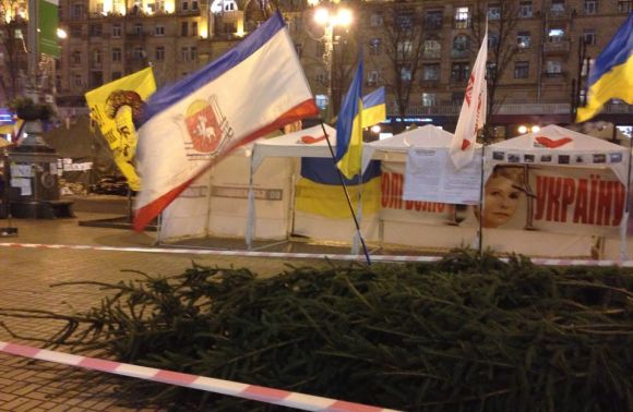 Мітингувальники ще вирішують те, де вони встановлять це дерево (на фото), а наразі поклали його біля будівлі КМДА.