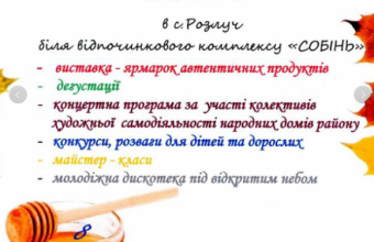 У суботу, 8 вересня, в селі Розлуч на Турківщині відбудеться районний фестиваль меду, в ході якого уміння й таланти бойківчан і їхніх гостей-партнерів продемонструють не тільки бджолярі, а й сировари, народні умільці, люди, які працюють в різних напрямках – травники, гіди, власники агроосель, агроколекціонери.