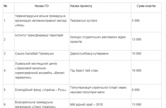 У прес-службі Львівської ОДА також опублікували перелік переможців конкурсу мистецьких проектів серед громадських організацій.