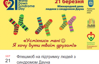 У прес-службі Львівської міськради повідомили сьогодні, 19 березня: «З нагоди Міжнародного дня людини з синдромом Дауна у Львові відбудеться яскравий флешмоб «Усміхнись мені. Я хочу бути твоїм другом». Захід організовує ГО «Розправлені крила» за підтримки Львівської міської ради».