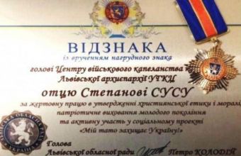 «Львівська обласна рада нагородила відзнакою з врученням нагрудного знака отця Степана Суса – синкела у справах капеланства Львівської Архиєпархії УГКЦ та настоятеля Гарнізонного храму святих апостолів Петра і Павла. Нагороду військовому капелану вручив голова облради Петро Колодій. Відзнаку Львівської облради отцю Степану Сусу вручено «за жертовну працю в утвердженні християнської етики і моралі, патріотичне виховання молодого покоління та активну участь у соціальному проекті «Мій тато захищає Україну!», – повідомили сьогодні, 19 листопада, на інформаційному порталі пасторального та соціального служіння капеланів Львівської архиєпархії УГКЦ «Капеланство.info».