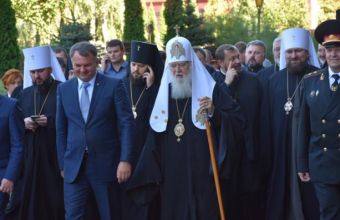Розпочалися урочистості святою Літургією, яку очолив Патріарх Філарет у церкві Покрови Пресвятої Богородиці, що на території університету».