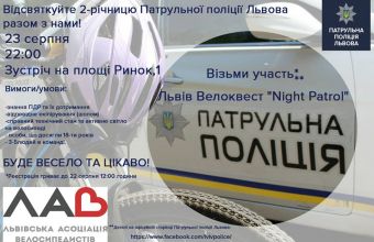 В управлінні патрульної поліції Львова повідомили сьогодні, 17 серпня: «Долучайтеся до велоквесту «Night Patrol», організаторами якого є патрульна поліція Львова та Львівська асоціація велосипедистів. Створіть свою команду, зареєструйте за посиланням до 22 серпня 2017 року 12 години дня. Подальші правила Вам розкажуть патрульні за телефоном вказаним в анкеті».
