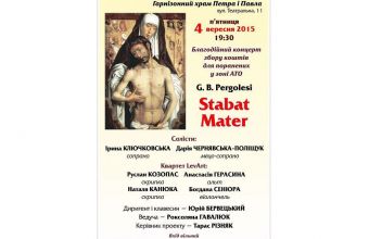 Сьогодні, 4 вересня 2015 року, о 19.30 у Гарнізонному храмі святих апостолів Петра і Павла на вулиці Театральній, 11 відбудеться благодійний вечір духовної музики, зібрані кошти під час якого будуть спрямовані на допомогу військовим, пораненим у зоні АТО. Цього вечора усі гості матимуть змогу послухати відому композицію «Stabat Mater» («Мати Скорботна»), яку називають католицьким гімном і музику для якого написав італійський композитор Джованні Баттіста Перголезі. Про це повідомили сьогодні, 3 вересня, на інформаційному порталі пасторального та соціального служіння капеланів Львівської архиєпархії УГКЦ «Капеланство.info», де також зазначили: «Запрошуємо прихожан та гостей храму! Вхід вільний.