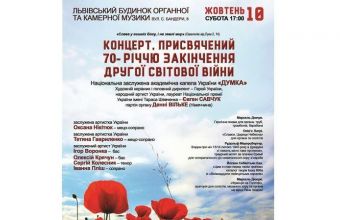 «10 жовтня о 17:00 у Будинку органної та камерної музики відбудеться концерт, присвячений 70-річчю закінчення Другої світової війни. До Львова завітає Національна заслужена академічна капела України «Думка» (художній керівник – головний диригент Герой України, лауреат Національної премії імені Тараса Шевченка, народний артист України – Євген Савчук). Партія органу Денні Вільке (Німеччина)», – повідомили «Щоденному Львову» у Львівській обласній філармонії, де також розповіли: