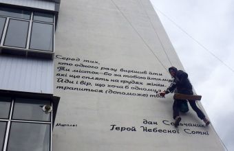 А волонтер Тарас Матвіїв розповів: «Дев’ять рядків вірша Героя Майдану Богдана Сольчаника ми писали впродовж трьох днів. Чи вийшло – хай оцінюють перехожі. Знаю одне – Орест дуже старався! Він щодня по п’ять годин, висячи на висоті третього поверху, виводив кожну літеру. Його не можна було відволікати. Тож мені довелось побувати у ролі підсобника й охоронця».