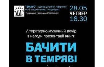 Центр духовної підтримки осіб з особливими потребами «Емаус» запрошує на літературно-музичний вечір, який відбудеться в рамках презентації книги Джона Галла «Бачити в темряві».