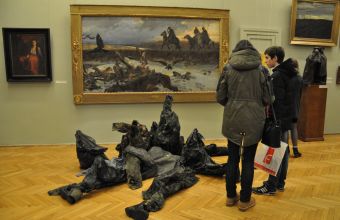Перед картиною польського художника 19 століття Вайцеха Коссака «Весна 1813» митець Орест Денисенко виклав на купу речі, одяг, каски, взуття бійців АТО. Деякі речі брудні, із слідами від куль, вогню. Назвав інсталяцію «По законам військового часу».