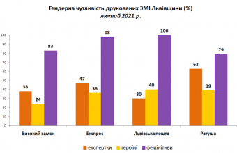 Найбільш гендернозбалансованими є публікації газети «Ратуша» (63% експерток і 37% експертів, 39% героїнь / 61% героїв) та газети «Експрес» (47% експерток / 53% експертів, 36% героїнь / 64% героїв). А «Львівська пошта» у лютому стала абсолютним лідером з використання фемінітивів (100%). Найменш гендернозбалансовані (співвідношення жінки/чоловіки) – матеріали газети «Високий замок» (лише 24% героїнь і 38% експерток публікацій).