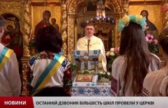 Львівські учні вперше на останньому дзвонику у церкві. Молились та слухали проповідь священика. Таку ініціативу рекомендувала міська рада, бо «лінійки», мовляв, радянський пережиток.