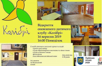 У понеділок, 16 вересня, о 16.00 на вулиці Пасічній у Львові розпочнеться урочиста церемонія відкриття оновленого дитячого клубу «Колібрі».