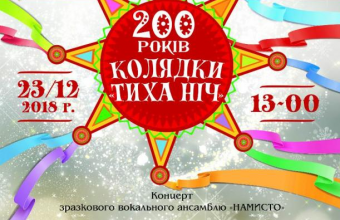 Зразковий вокальний ансамбль «Намисто» Львівського міського палацу культури імені Гната Хоткевича під керівництвом Марії Сергійчук виконає 23 грудня у виставковій залі музею історії релігії колядку «Тиха ніч» німецькою, англійською, польською і українською мовами. Звучатимуть й інші колядки та різдвяні пісні різних народів світу. Початок – о 13:00 годині. Вхід – вільний.