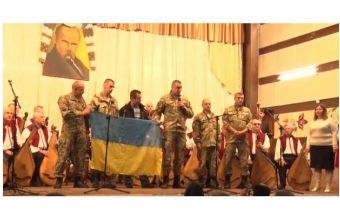 На захід привітати незрячих завітали бійці 122-го окремого аеромобільно-десантного батальйону. 30 листопада минулого року УТОС проводило благодійний концерт у Палаці Хоткевича. За зібрані гроші закупили рації, які відправили цим військовим. Сьогодні хлопці подякували незрячим і подарували їм синьо-жовтий прапор, привезений із зони