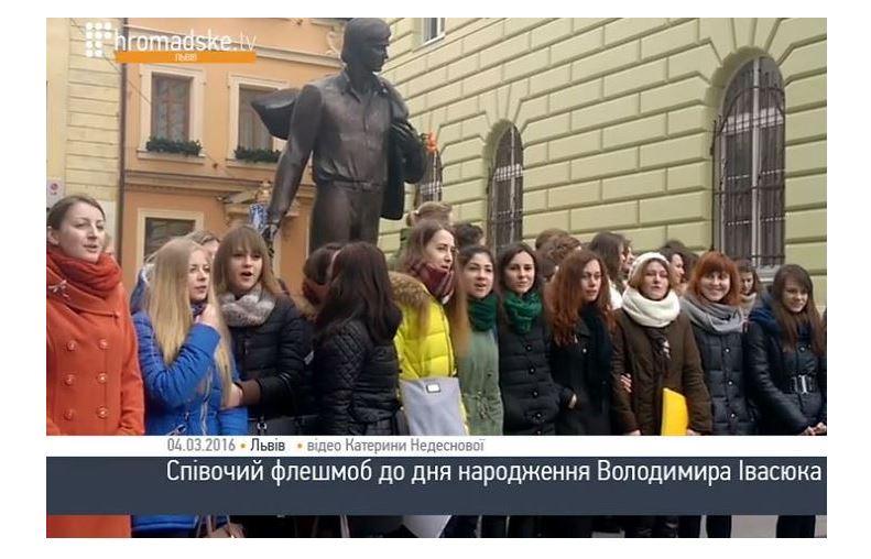 «У день народження композитора і поета Володимира Івасюка львівські студенти організували пісенний флешмоб біля його пам'ятника. Впродовж півгодини молоді львів'яни виконували легендарні хіти композитора. Сьогодні Івасюку виповнилося б 67 років», – повідомили сьогодні, 4 березня, на «Громадському телебаченні». Натомість на «Телеканалі новин «24» зауважили: «До пам'ятника композитору прийшли студенти та старші люди, аби піснею вшанувати річницю його народження».