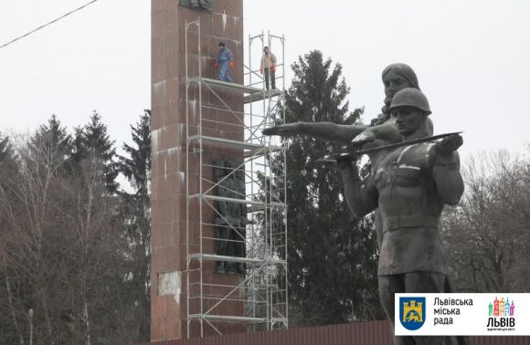 У середу, 23 січня, на вулиці Стрийській у Львові розпочали встановлювати риштовання для демонтажу гостроаварійної стели Монументу Слави.