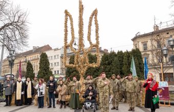 Сьогодні, 23 грудня, у Львові десантники 80-ї окремої десантно-штурмової Галицької бригади презентували найбільший в Україні та оновлений Тризуб, виготовлений з дідухів.