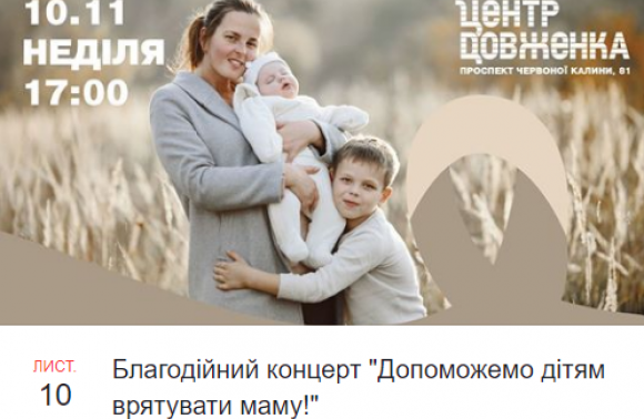 У неділю, 10 листопада, о 17.00 в «Центрі Довженка» на проспекті Червоної Калини у Львові розпочнеться благодійний концерт «Допоможемо дітям врятувати маму!».