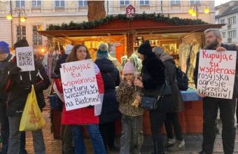 Білоруські активісти з місцевої діаспори підготували плакати з текстом про цю тіньову діяльність монастиря. Пікетувальники підійшли до намету, щоб попередити покупців, що купуючи тут товари, вони можуть спонсорувати війну в Україні.