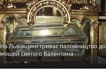 В агенції Укрінформ повідомили сьогодні, 14 лютого: «На Львівщині триває паломництво до мощей святого Валентина. Паломники із України, Польщі та інших держав прибувають до карпатського містечка Самбір на Львівщині. Вони прямують до храму Різдва Пресвятої Богородиці, де зберігаються мощі святого Валентина, якого вшановують як заступника усіх закоханих».