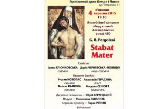 Завтра, 4 вересня 2015 року, о 19.30 у Гарнізонному храмі святих апостолів Петра і Павла на вулиці Театральній, 11 відбудеться благодійний вечір духовної музики, зібрані кошти під час якого будуть спрямовані на допомогу військовим, пораненим у зоні АТО. Цього вечора усі гості матимуть змогу послухати відому композицію «Stabat Mater» («Мати Скорботна»), яку називають католицьким гімном і музику для якого написав італійський композитор Джованні Баттіста Перголезі. Про це повідомили сьогодні, 3 вересня, на інформаційному порталі пасторального та соціального служіння капеланів Львівської архиєпархії УГКЦ «Капеланство.info», де також зазначили: «Запрошуємо прихожан та гостей храму! Вхід вільний.