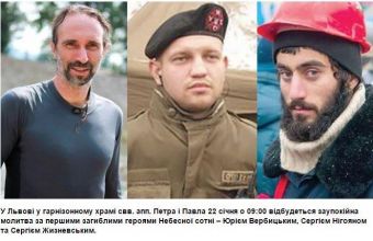 Юрій Вербицький – науковець зі Львова, викрадений у Києві 21 січня, помер від катувань; Сергій Нігоян – 20-ти річний вірменин з Дніпропетровщини, який був охоронцем Євромайдану в Києві, вбитий під час подій біля стадіону «Динамо» 22 січня; Сергій Жизневський – білоруський активіст Євромайдану та журналіст, член Самооборони Майдану, загинув також 22 січня на вул. Грушевського у Києві. Управління внутрішньої політики Львівської міської ради закликає усіх небайдужих долучитись до спільної молитви та вшанування пам’ять перших Героїв Небесної».