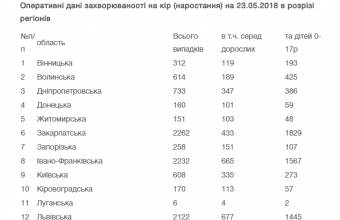 «Найбільше людей захворіли на кір у Закарпатській (всього 2262 людини – 433 дорослих і 1829 дітей), Івано-Франківській (всього 2232 людини – 665 дорослих і 1567 дітей), Львівській (всього 2122 людини: 677 дорослих і 1445 дітей), Одеській (всього 1643 людини – 813 дорослих і 830 дітей) та Чернівецькій (всього 1113 людей – 370 дорослих і 743 дитини) областях», – поінформували також у прес-службі міністерства охорони здоров’я України.
